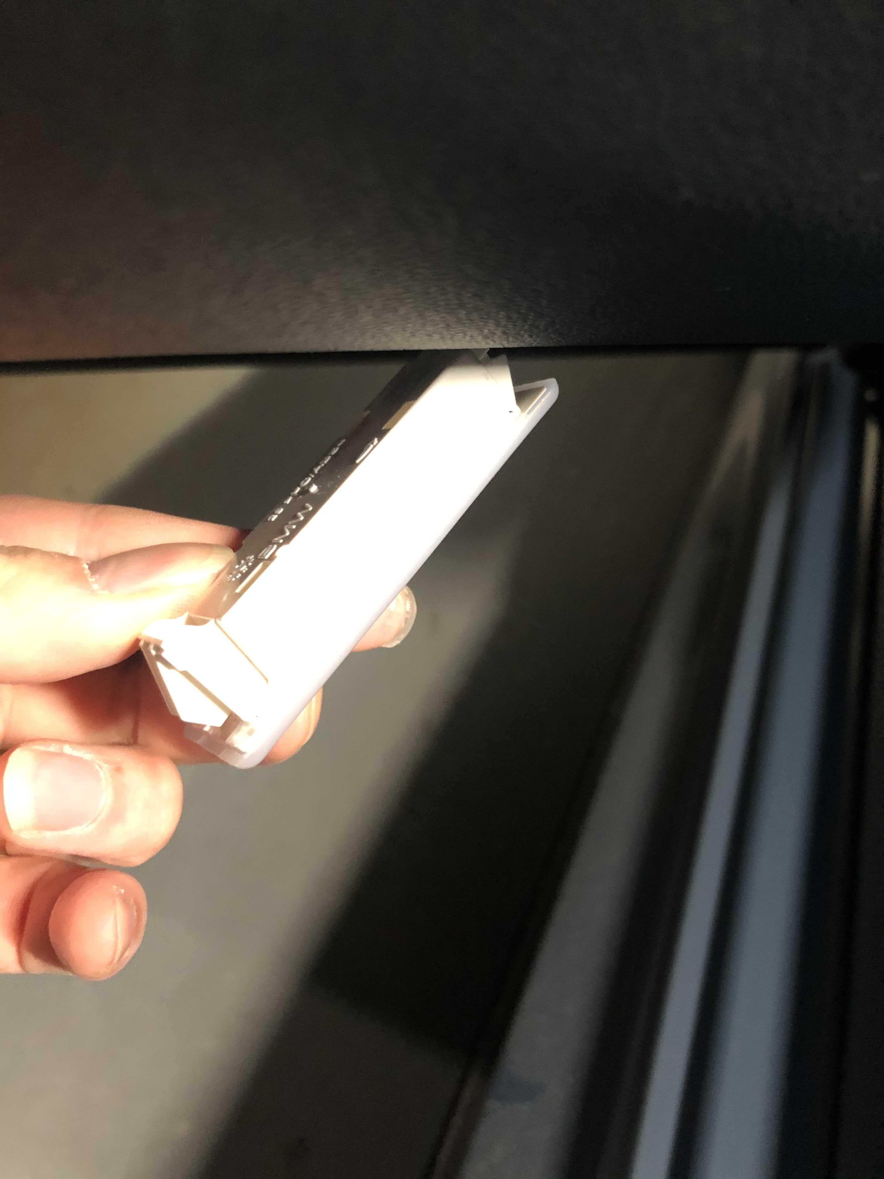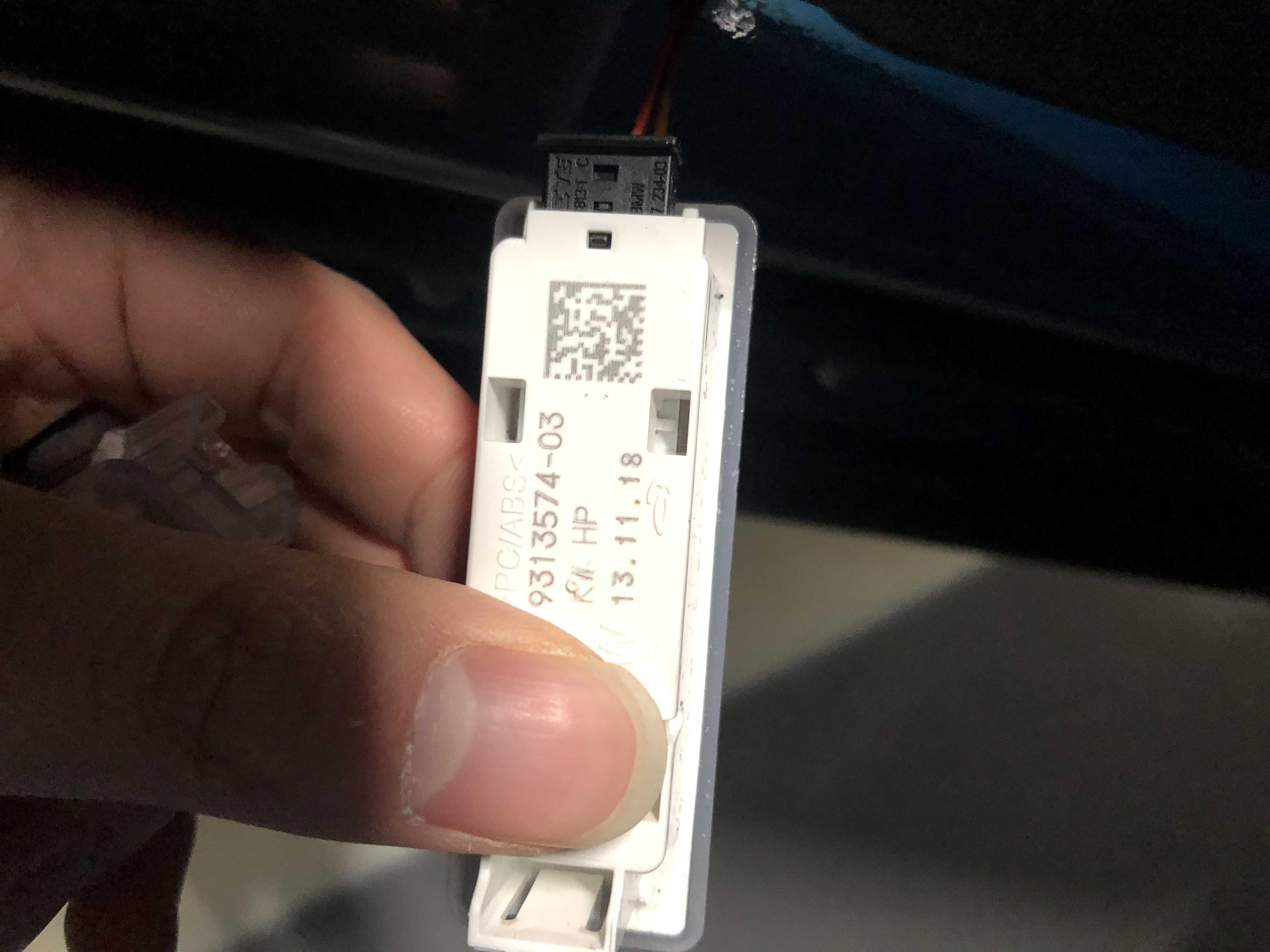 그렇게 빼면 위 사진처럼 순정 도어라이트가 나오는데, 검은색 단자를 뽑으면 된다. 그냥 힘으로 뽑아도 되지만, 뾰족한 도구를 이용해 까만색 홈을 누르면 좀 더 쉽게 뽑을 수 있다.