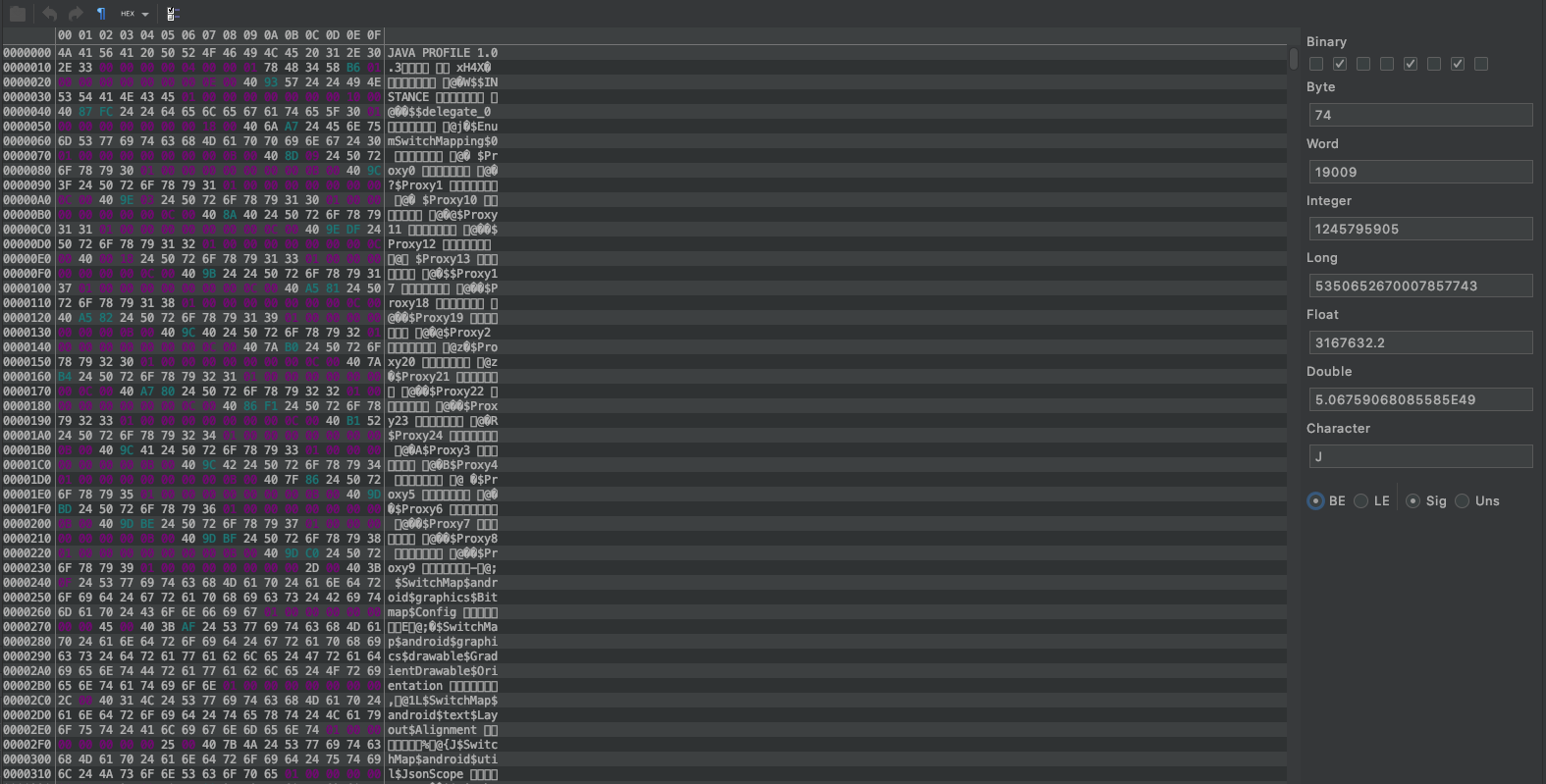 안드로이드 프로젝트에서 현재 메모리에 있는 String 정보들을 봐야 할 경우가 생겨서 메모리 덤프 후, 메모리 내에 어떠한 String 정보들이 보여지고 있는지 BinEd 플러그인을 활용했다. 목표는 어떠한 값이 암호화 되어야 하며, 메모리 내에 평문으로 보이지 않도록 하는 것이므로, 메모리 덤프 후 평문으로 검색했을 때 아무런 값도 매치되지 않아야 정상이다.