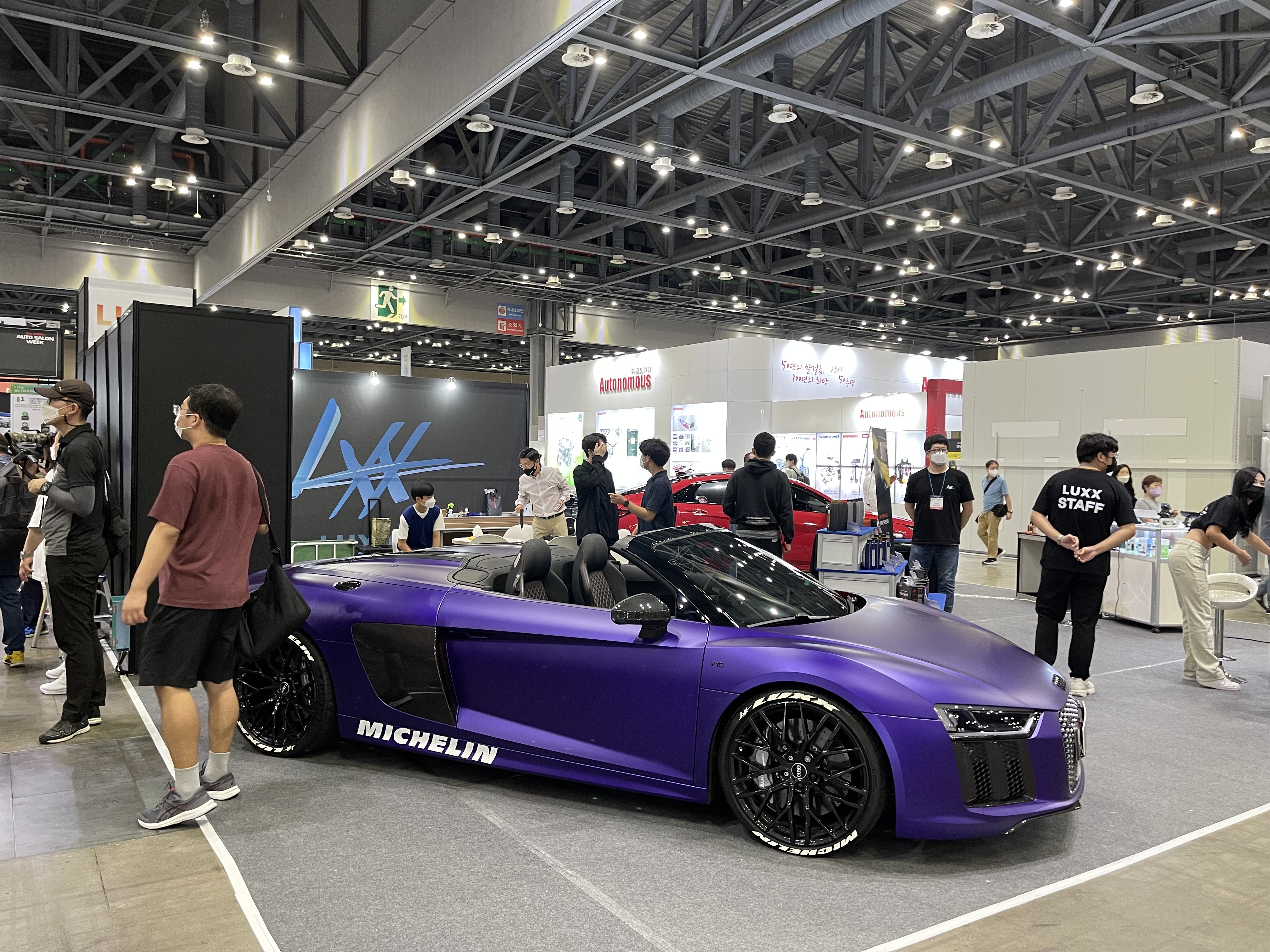 포드 GT는 진짜 유튜브나 인터넷으로만 봤지 실물은 처음봤는데, 진짜 눈앞에서 보이는 포스가 장난 아니었다. 또 럭팔이를 실물로 영접했는데, 보라색 컬러감이 진짜 대박이었다. 휠도 꽉찬 것이 레터링까지 붙이니까 차량이 더욱 웅장해보이는 효과가있었다.
